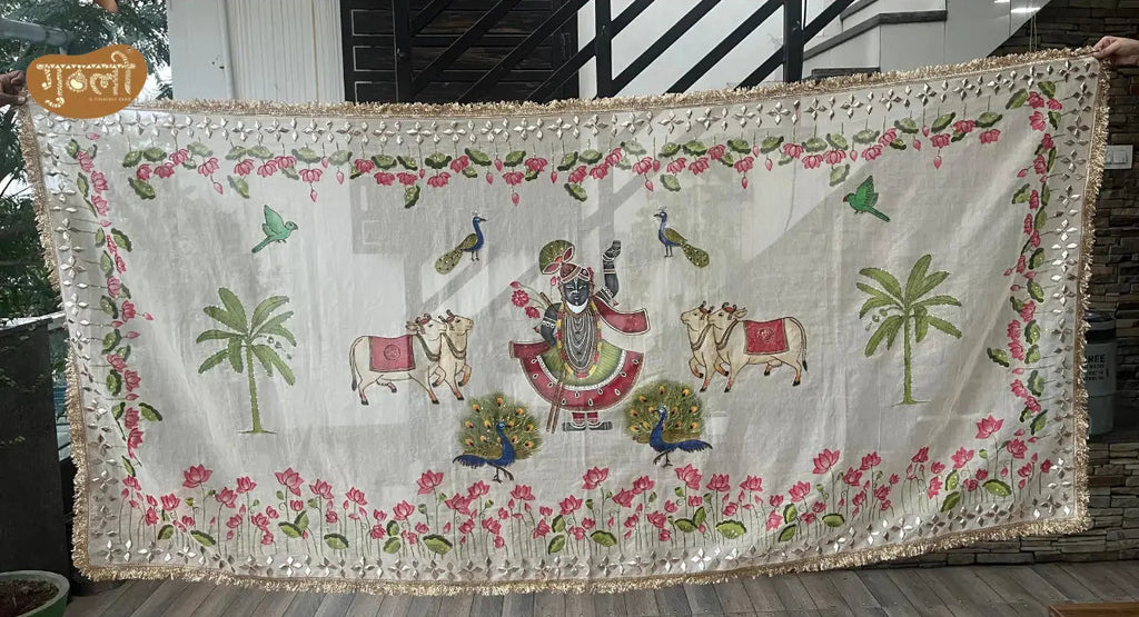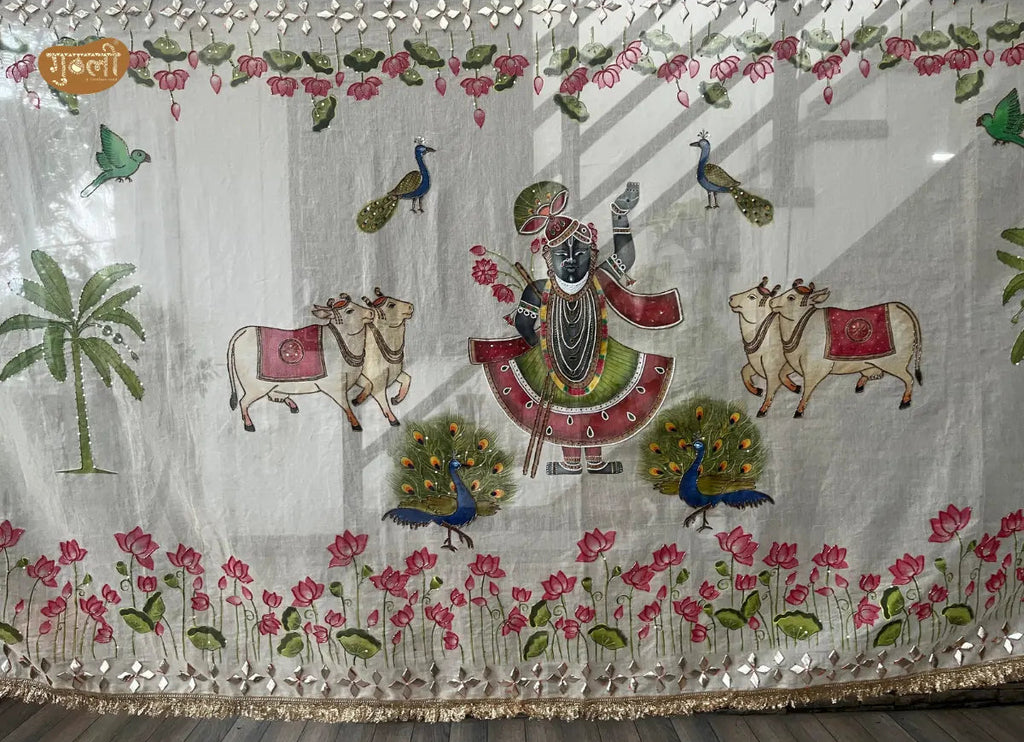This Dupatta is a serene expression of devotion and artistry. Crafted on a pure white base it features hand painted Shreenathji motif surrounded by symbolic cows, graceful peacocks, and blooming lotus motifs inspired by traditional Pichwai art